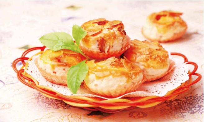 6.打开箱门,把杏仁核桃酥取出,刷上一层蛋黄,再烤2分钟,最后取出装入盘中即可。