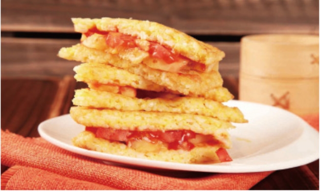 3.将米饼对半切开,分别放入菠萝、西红柿、番茄酱,叠在一起,均匀切成同等的块状。