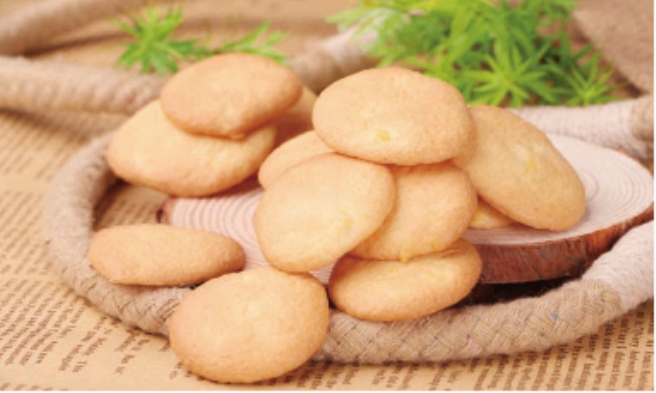 3.将材料挤入烤盘,制成数个圆形饼干生坯,将烤盘放入烤箱中。