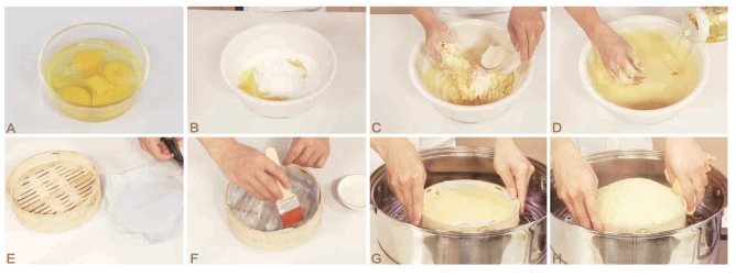 7.把面浆倒入蒸笼里,将蒸笼放入蒸锅中,用大火蒸20分钟至面浆熟透。