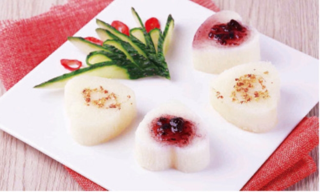 这道甜品的成菜呈心形,造型美观,清新爽目,甜香可口,粘软酥沙,颇受甜品爱好者的宠幸。