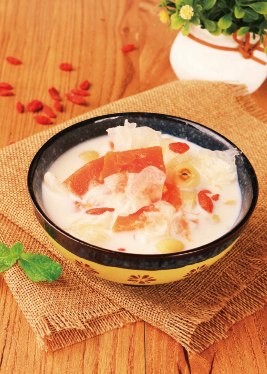 软软滑滑的木瓜在口里似有若无地游荡,掺着枸杞的甜,银耳的润,牛奶的醇,莲子的香,再配上赏心悦目的色彩,一经品尝,便从此爱上,难以忘怀。