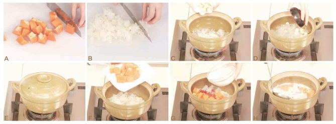 6.揭开盖,倒入备好的木瓜块,放入泡好的枸杞。