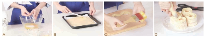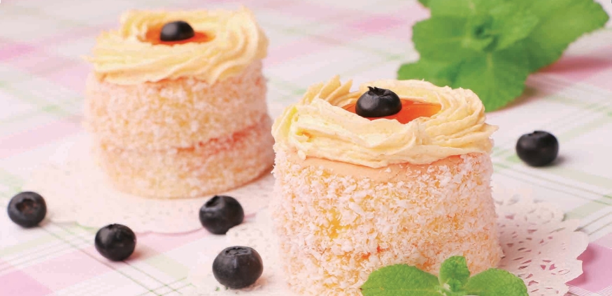 3.将蛋糕翻面,用模具压出两块圆形小蛋糕,把两块蛋糕叠在一起,四周刷上一层果酱,粘上一层椰蓉。