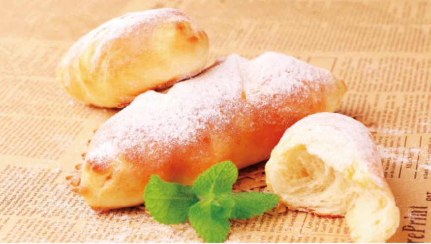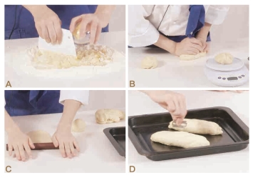 3.取一个面团,压扁,擀薄,卷成橄榄形状,收紧口,装在烤盘中,依此法制成另一个生坯,装在烤盘中,待发酵。