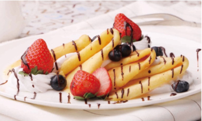 黄奶油15克,低筋面粉100克,鲜奶250毫升,鸡蛋3个,鲜奶油、草莓、蓝莓、黑巧克力液各适量