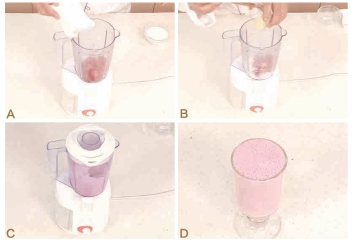 3.加盖,将榨汁杯安在底座上,启动榨汁机,开始榨汁。