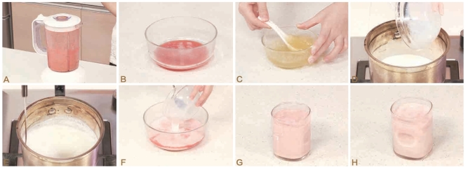 6.取一空碗,倒入奶汁,待稍放凉后加入西瓜汁中,搅拌均匀,制成布丁汁。