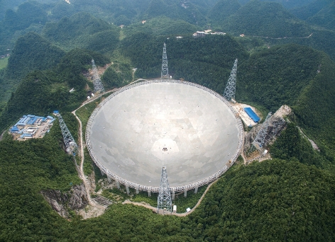 有着“中国天眼”之称的500米口径球面射电望远镜,位于贵州省黔南州平塘县,远远看去像一个巨大的“锅”,接收面积相当于30个足球场。