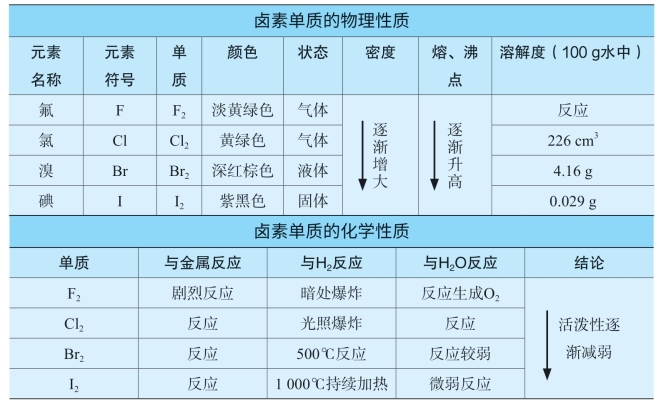 氟、氯、溴、碘等元素在原子结构和元素性质上具有一定的相似性,化学上常把他们放在一起研究,称为卤族元素,简称卤素。卤素位于元素周期表的第ⅦA族,其物理性质和化学性质见表3-1。