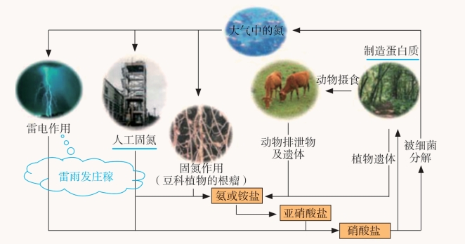 在自然界中,大豆、蚕豆等豆科植物根部的根瘤菌把空气中的氮气转变为硝酸盐等含氮的化合物。植物的根从土壤中吸收的铵根离子和硝酸盐,经过复杂的生物转化形成各种氨基酸,氨基酸最后转化为蛋白质。动物以植物为食物而获得植物蛋白,并将其转化为动物蛋白。动植物遗体中的蛋白质被微生物分解成NH4+、 NO3- 和NH3,又回到土壤和水体中,被植物再次吸收利用。另外,在放电条件下,空气中少量的氮气与氧气化合成氮的氧化物,这些氮的氧化物随降水进入土壤和水体。