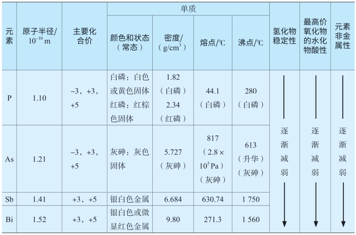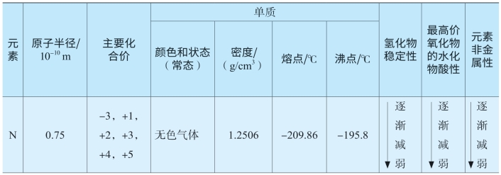 元素周期表中第ⅤA族元素包括氮(N)、磷(P)、砷(As)、锑(Sb)、铋(Bi)5种元素,统称为氮族元素。其中,氮、磷、砷是非金属元素,锑、铋是金属元素。该主族是一个典型的由非金属至金属的完整过渡族。氮族元素的性质见表3-3。