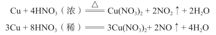 浓硝酸和稀硝酸都具有氧化性,几乎能与所有金属(除金、铂以外)和非金属发生氧化还原反应。与金属铜的反应如下: