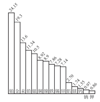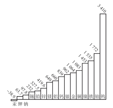 金属在常温下,除汞是液体外,其余都是固体。不同的金属,因核电荷数、电子层结构和半径的不同,因而密度、硬度、熔点等性质差别很大。