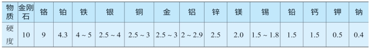 表4-5 几种金属的硬度与金刚石硬度的比较