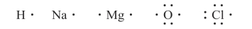 在化学反应中,一般都是原子的最外层电子参与反应。为方便起见,我们可以在元素符号周围用“·”或“×”来表示原子的最外层电子,这种式子叫作电子式。例如,H、Na、Mg、O、Cl原子的电子式分别为