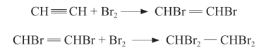 将乙炔通入溴水或Br2的CCl4溶液,会使溴水或Br2的CCl4溶液褪色。这是由于乙炔中含有不饱和键,使其和Br2发生了加成反应(addition reaction)。