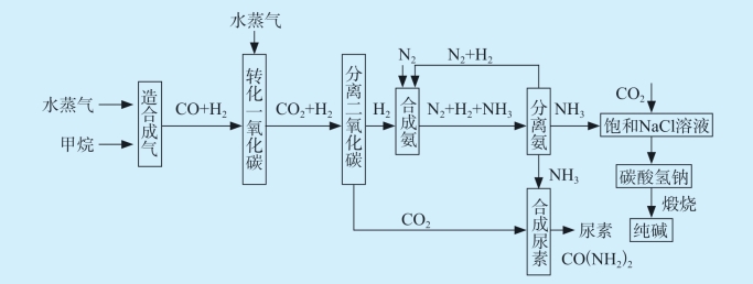 天然气合成尿素[CO(NH2)2],主要是利用甲烷在水蒸气的作用下,产出含有CO和H2的合成气,向经过处理后的合成气中通入N2,在一定条件下合成氨,进一步生产出尿素。