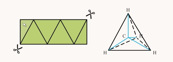 1.做甲烷模型:裁一段长25 cm、宽8.7 cm的矩形纸板或硬纸条,按下图所示方式,裁去两头的小三角,按虚线向内折成如图所示的正四面体,其顶点分别为甲烷中4个氢原子的位置,中心是碳原子。
