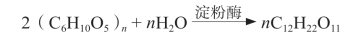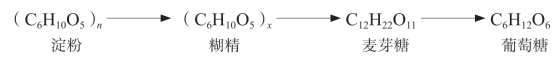 淀粉[(C6H10O5)n]是由葡萄糖聚合而成的高分子化合物。食物进入口腔以后,在唾液淀粉酶的作用下,一小部分淀粉先水解为糊精[(C6H10O5)x],糊精再进一步水解为麦芽糖(C12H22O11)。