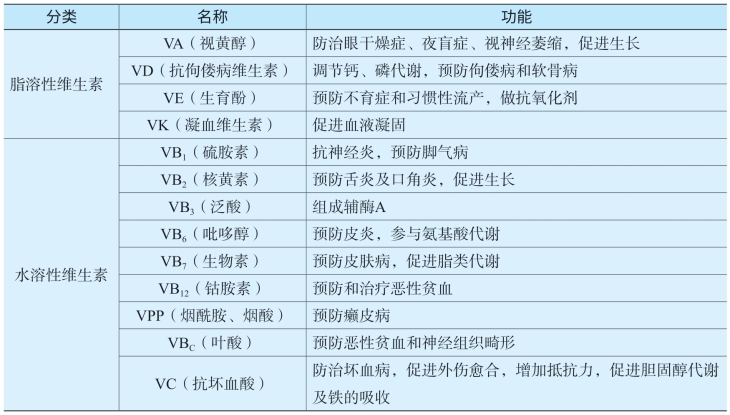 维生素按其溶解性可分为脂溶性和水溶性两大类。重要的维生素的分类、名称和功能见表8-1。