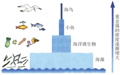 图9-18 水中的重金属污染物通过食物链被富集,浓度逐级加大
