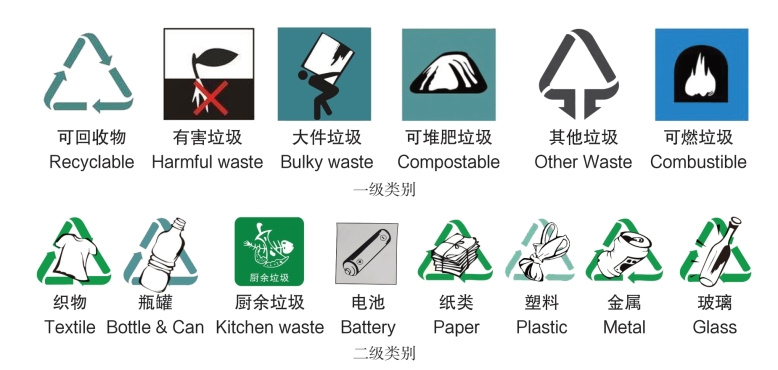 不同国家垃圾的分类方法不同。我国国家标准《城市生活垃圾分类标志》中有六个粗分的一级类别和八个细分的二级类别,各地可以根据实际情况选择使用。