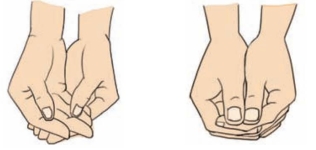 (2)手形:当球接近腹前时,两手掌根紧靠,两手手指重叠后合掌互握,两拇指平行,手腕下压,两臂外翻形成一个平面(图2-2-2)。