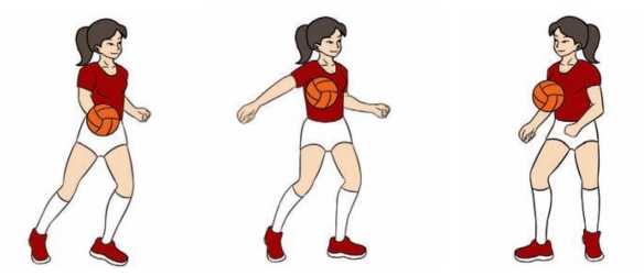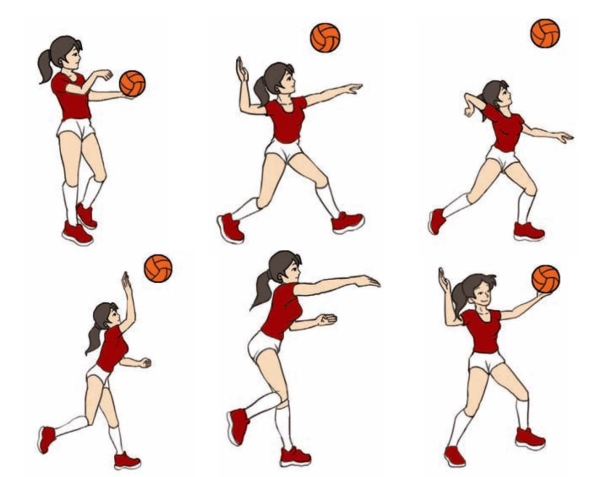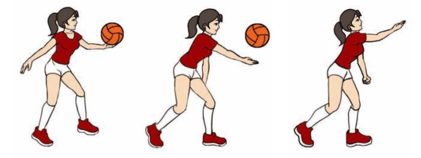 动作要领:左肩对网,两脚左右开立,与肩同宽。两膝微屈,上体稍前倾,重心落在两脚之间,左手持球于腹前。左手将球平稳抛至胸前约一臂距离,离手约30cm高。在抛球的同时,右臂摆至右侧下方,接着利用右脚蹬地向左转体的力量,带动右臂向前上方摆动,在腹前用全掌击球的后下方。击球后,立即进场比赛(图2-2-5)。