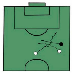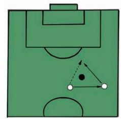 踢墙式二过一是两名进攻队员通过两次传球越过一名防守队员的配合方式,如图2-3-9所示。对持球队员的要求: