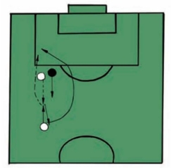 ③回传后,迅速转身,向防守队员身后空当快速插上。