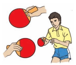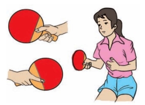 虎口贴拍,拇指在拍前,食指在拍后,此握法又称为八字式。正手攻球时食指向上移动;反手攻球时拇指向上移动(图2-4-2)。