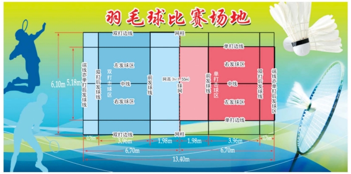 羽毛球场地标准尺寸:羽毛球场为一长方形场地,长度为13.40m,双打场地宽为6.10m,单打场地宽为5.18m。球场上各条线宽均为4cm,丈量时要从线的外沿算起。球场界限最好用白色、黄色或其他易于识别的颜色画出。按国际比赛规定,整个球场上空空间最低为9m,在这个高度以内,不得有任何横梁或其他障碍物,球场四周2m以内不得有任何障碍物。任何并列的两个球场之间,最少应有2m的距离。球场四周的墙壁最好为深色,不能有风(羽毛球场地标准尺寸图解见图图2-5-9)。