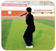 两腿略立起,上身稍左转,左脚不动,右脚从右侧移至左脚前方,前脚掌虚点地面,身体重心落于左腿,成为右虚步。同时左臂屈肘将左拳收抱于左腰侧,拳心朝上,右臂随之外旋,前臂上屈成挎肘,以尺骨一面为力点,从右侧向身前里磕,拳眼朝右,拳面朝上。眼看右拳(图3-1-6)。