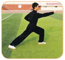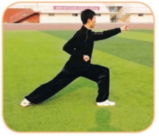 要点:冲拳要快而有力,拳略高过肩,右肩前顺,左肩后牵。