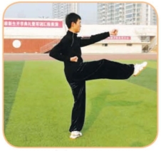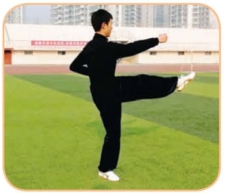 要点:收拳、冲拳、弹踢的动作同时完成,弹踢有力,支撑腿要稳,上身挺胸、直背,两肩松沉。