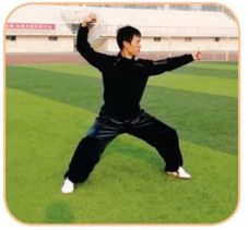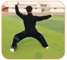 要点:上下肢动作要协调一致。做马步时,两脚平行,大腿坐平,两肩稍后张,左臂呈圆弧,右拳略高过肩,挺胸、塌腰。