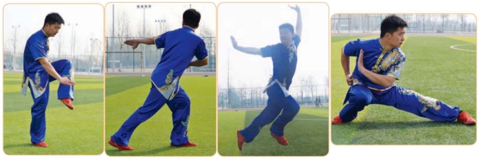 (3)右腿屈膝向前提起,左腿猛力蹬地向前跃出,两掌向前、向上划弧摆起,目视左掌。