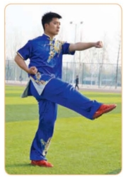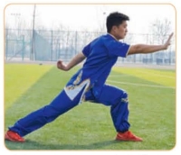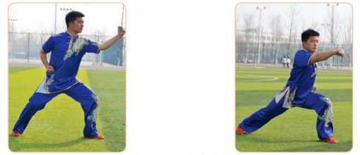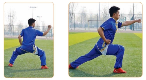 (2)右腿蹬直成左弓步,左拳收至腰侧,拳心朝上,右拳向前冲出,与肩平高,拳眼朝上,目视右拳。