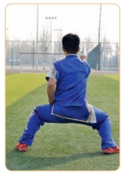 右脚向前落步,脚尖内扣,上体左转90°,左拳收至腰侧,两腿下蹲成马步,右拳向前冲出,目视右拳。
