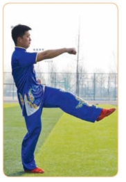 重心前移至左腿,右腿屈膝提起,脚面绷直,猛力向前弹出伸直,与腰平高;右拳收至腰侧,左拳向前冲出,目视前方。