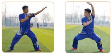 (1)重心移至两腿之间,左脚脚尖内扣成马步,上体右转;右臂向左侧平摆,稍屈肘,同时左勾手变掌由后经左腰侧从右臂内向前上穿出,掌心均朝上,目视左手。