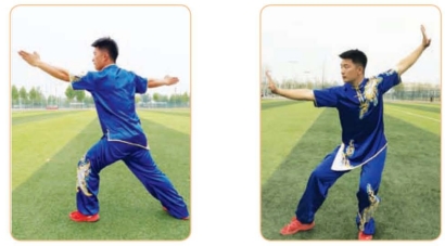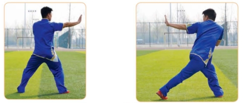 (1)两腿不动,左掌收至腰侧,掌心朝上;右掌向上、向右划弧,掌心朝下。