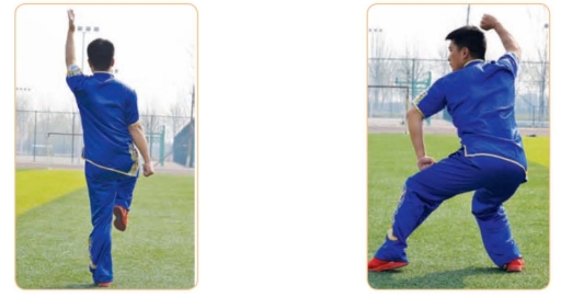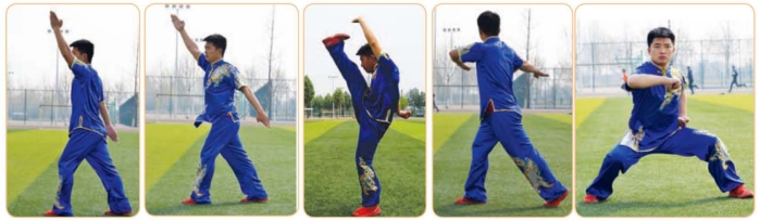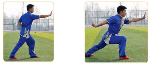 (1)右腿蹬直,重心前移至左腿,成左弓步;右掌稍下降,左掌随重心前移向前挑起。