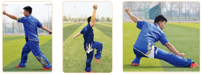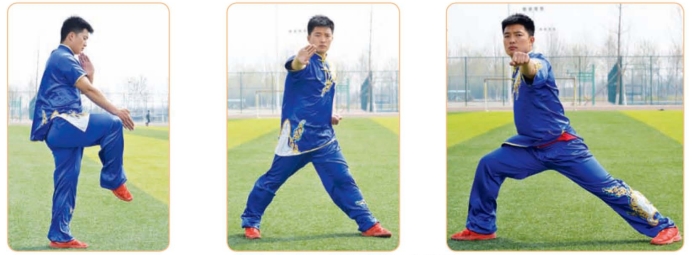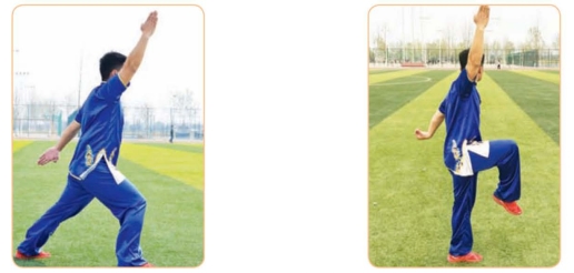 (2)左腿蹬直,右腿屈膝上抬,左拳变掌,右拳不变,两臂向前、向上划弧摆起,目随右拳转视。