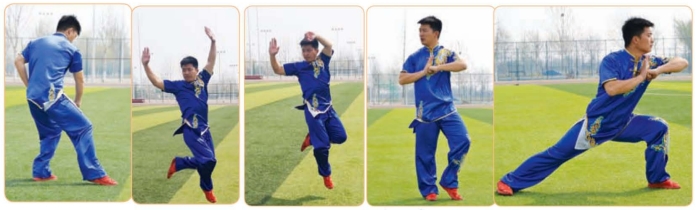 (1)左、右脚先后相继落地,左掌变拳收至腰间。