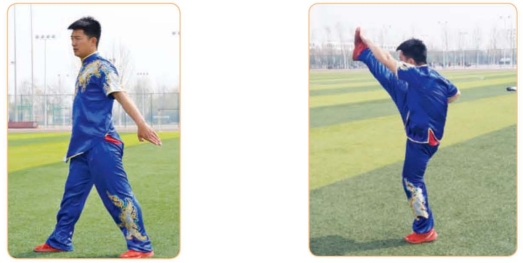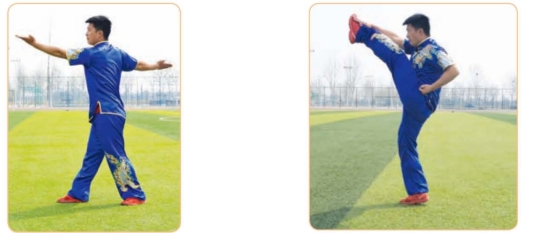 (2)左腿伸直向前上方踢起,脚面绷直,左掌变拳收至腰间,右掌由体后向上、向前拍击左脚面。