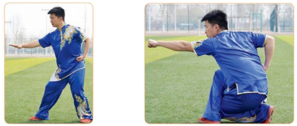 (2)身体右转90°,两腿全蹲成歇步,右掌变拳收至腰间;左拳由腰间向前下方冲出,拳心向下,目视左拳。