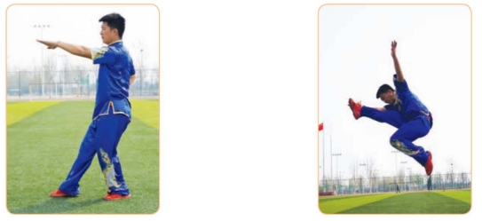 (1)右脚落地,左脚向前摆起,右脚猛力蹬地跳起,左腿屈膝继续前上摆,同时右拳变掌向前上方摆起,左掌先上摆而后下降拍击右掌背。