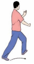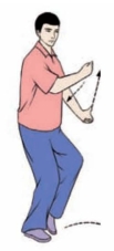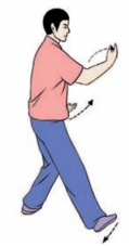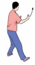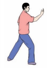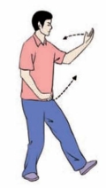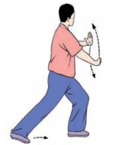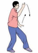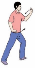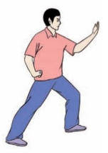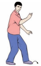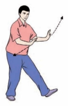 (6)上体微右转,右腿向右前方迈出,同时左右于随转体慢慢分别向左下、右上错开;眼视右手(图3-3-14)。
